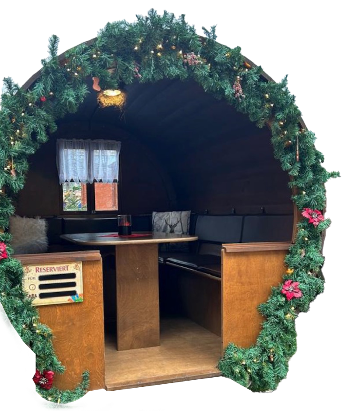 In unseren Fässern könnt ihr mit 8–10 Personen gemütlich zusammensitzen und die Feuerzangenbowle in entspannter Atmosphäre genießen.